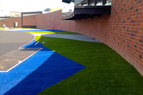 Renovación de áreas con pasto sintético de alta resistencia, diseñado para zonas de tránsito y soporte perimetral.